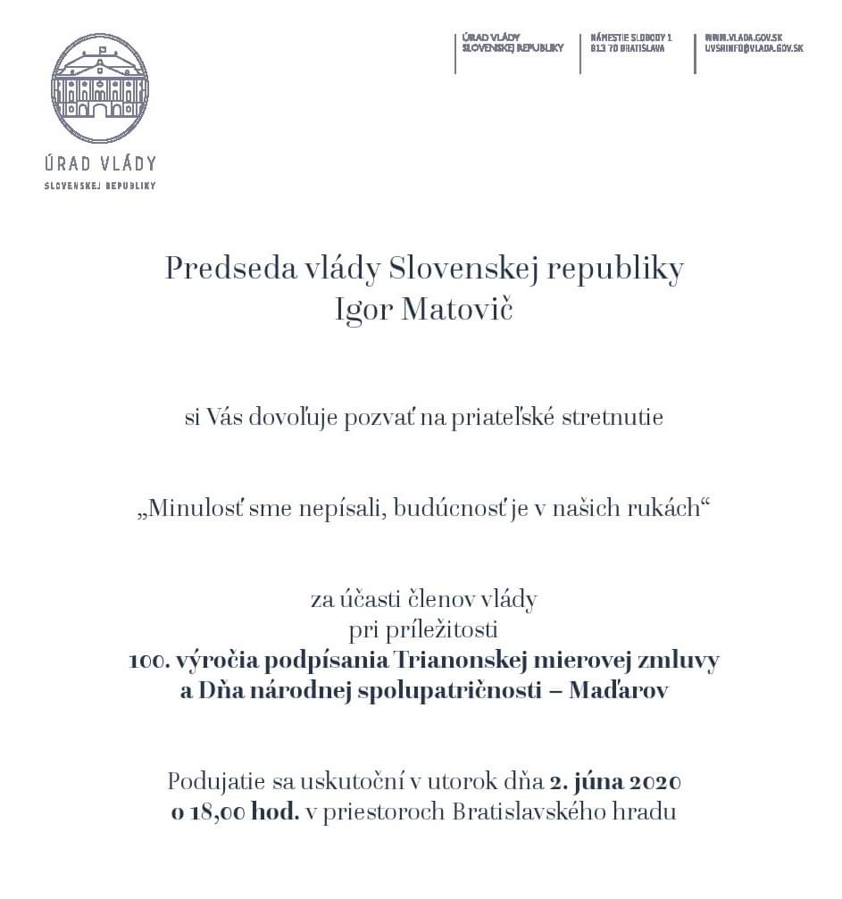 Fordítás: Igor Matovic, a Szlovák Köztársaság miniszterelnöke egy baráti beszélgetésre hívja meg Önt "A múltat nem mi írtuk, a jövő a mi kezükben van" a kormány tagjai jelenlétében, a Trianoni békeszerződés 100-ik évfordulójának és a Magyarok nemzeti összetartozásának alkalmából. Az eseményre kedden, 2020 június 2-án kerül sor 18:00-kor a Pozsonyi várban.